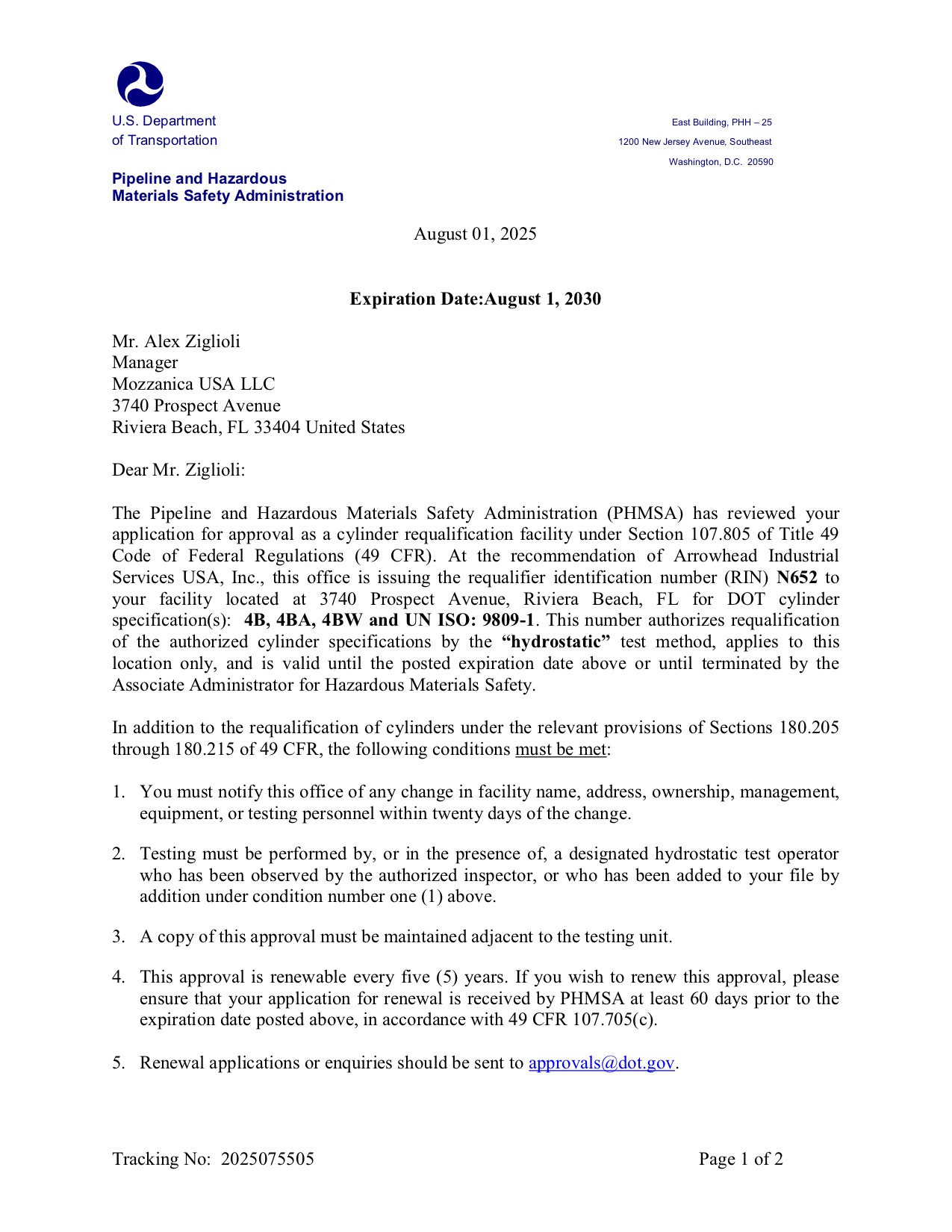 In August 2025, Mozzanica received approval from the US Department of Transport as a cylinder refurbishment facility for marine activities.
