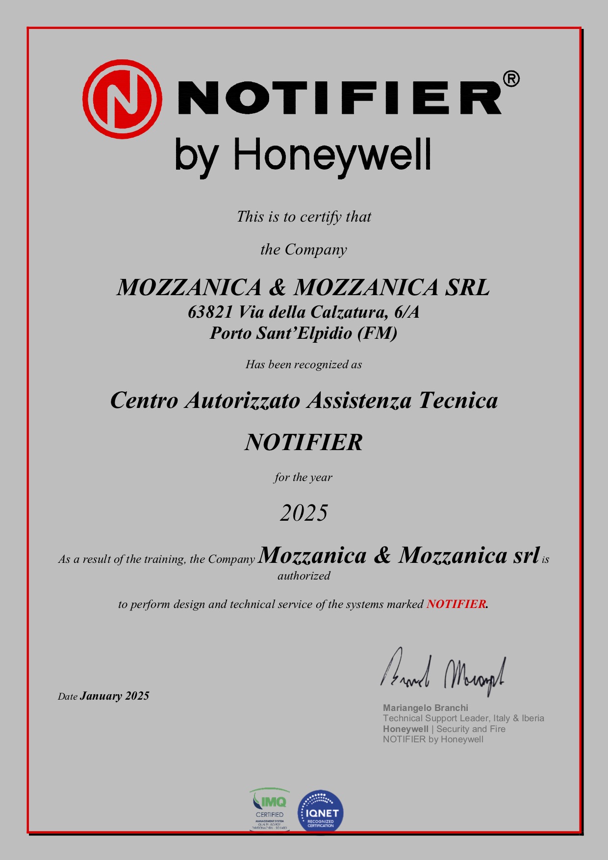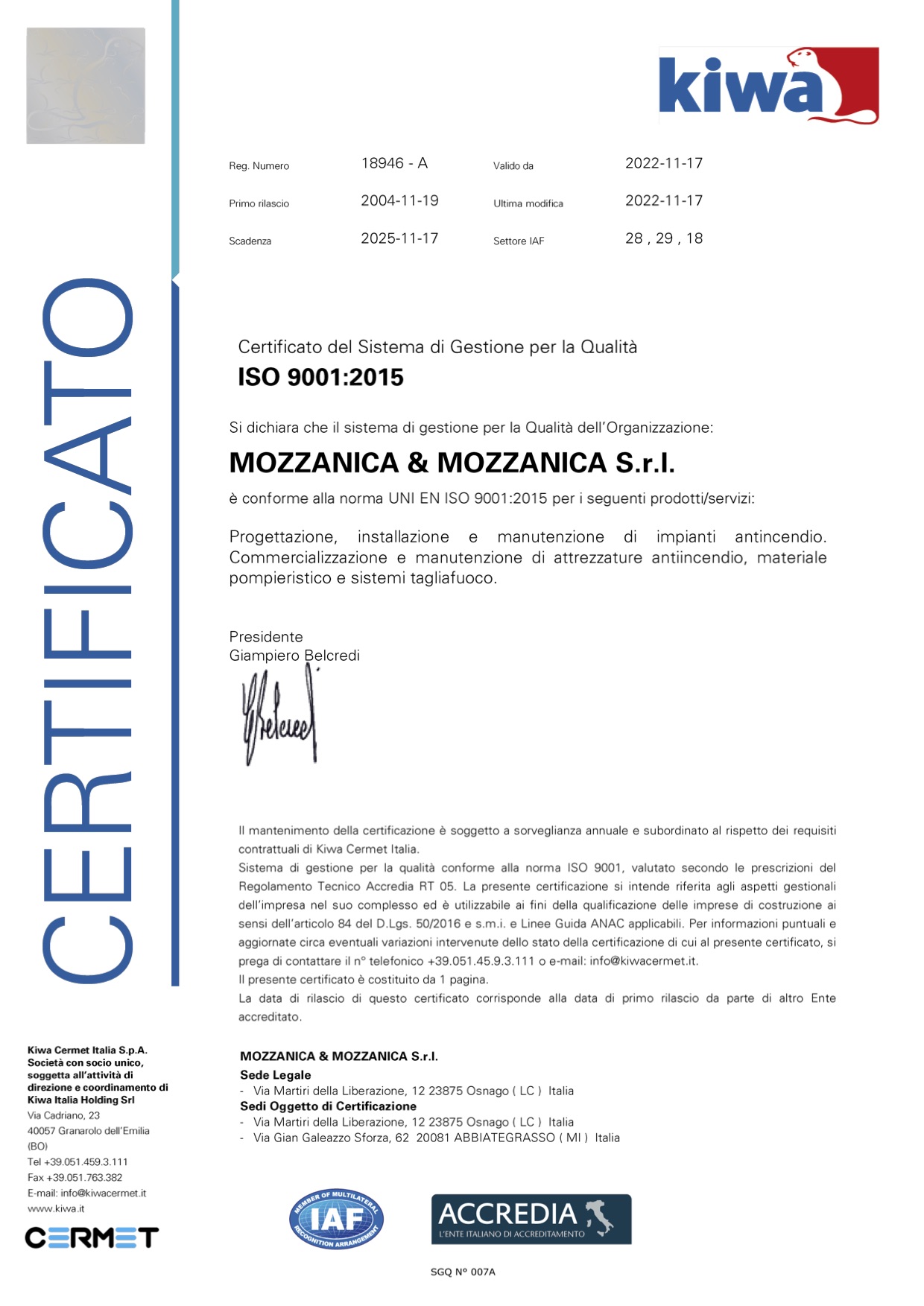 Dal 2004 Mozzanica adotta il sistema di gestione UNI EN ISO 9001:2015 per tutti processi aziendali, dalla progettazione, alla vendita, installazione e manutenzione di impianti e presidi antincendio realizzati secondo le diverse tecnologie.