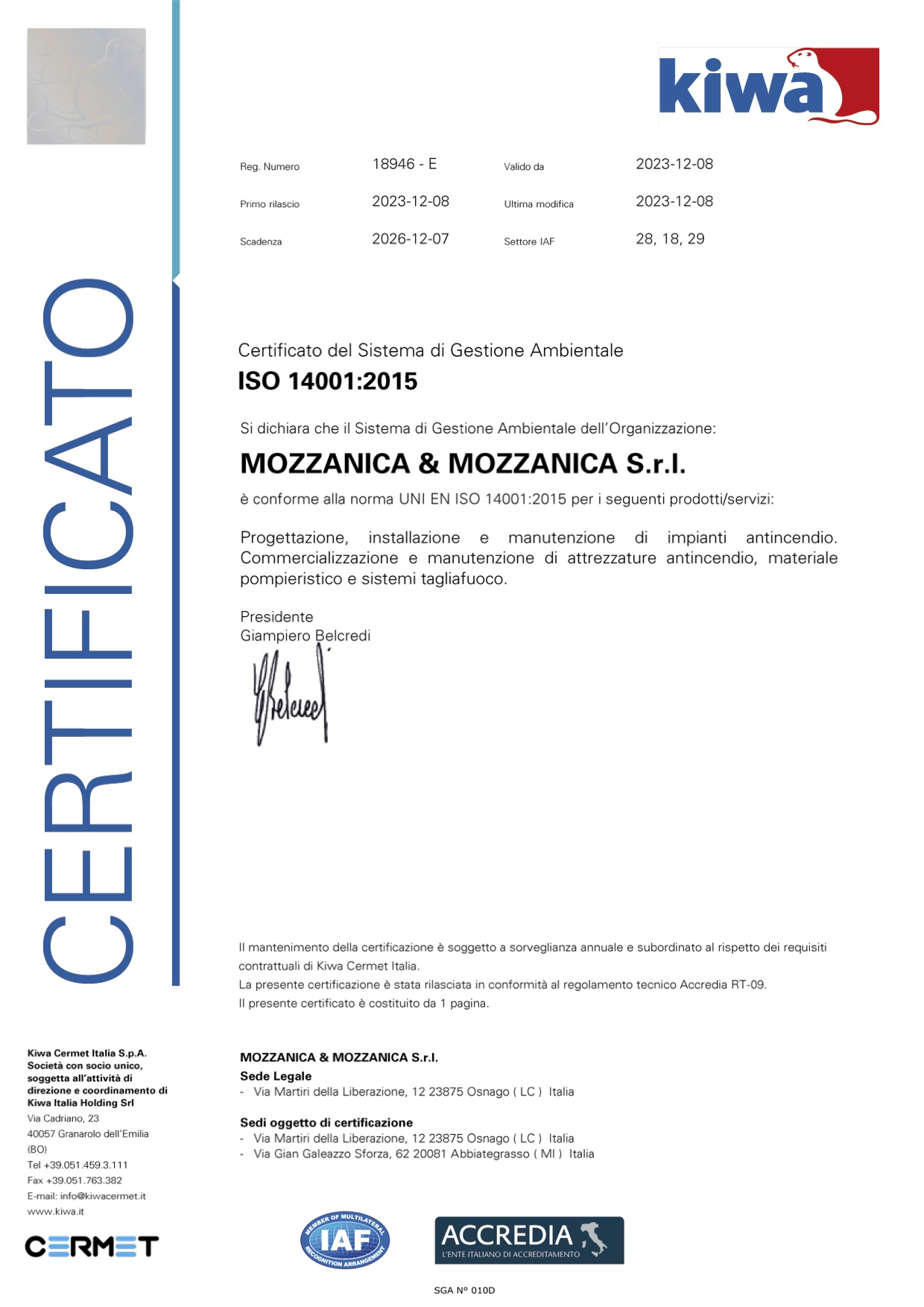 Nel 2023 Mozzanica completa il percorso di Gestione certificato con l'acquisizione della certificazione ISO 14001:2015 costruendo così un sistema di gestione integrato completo di tutti gli aspetti e requisiti ambientali.