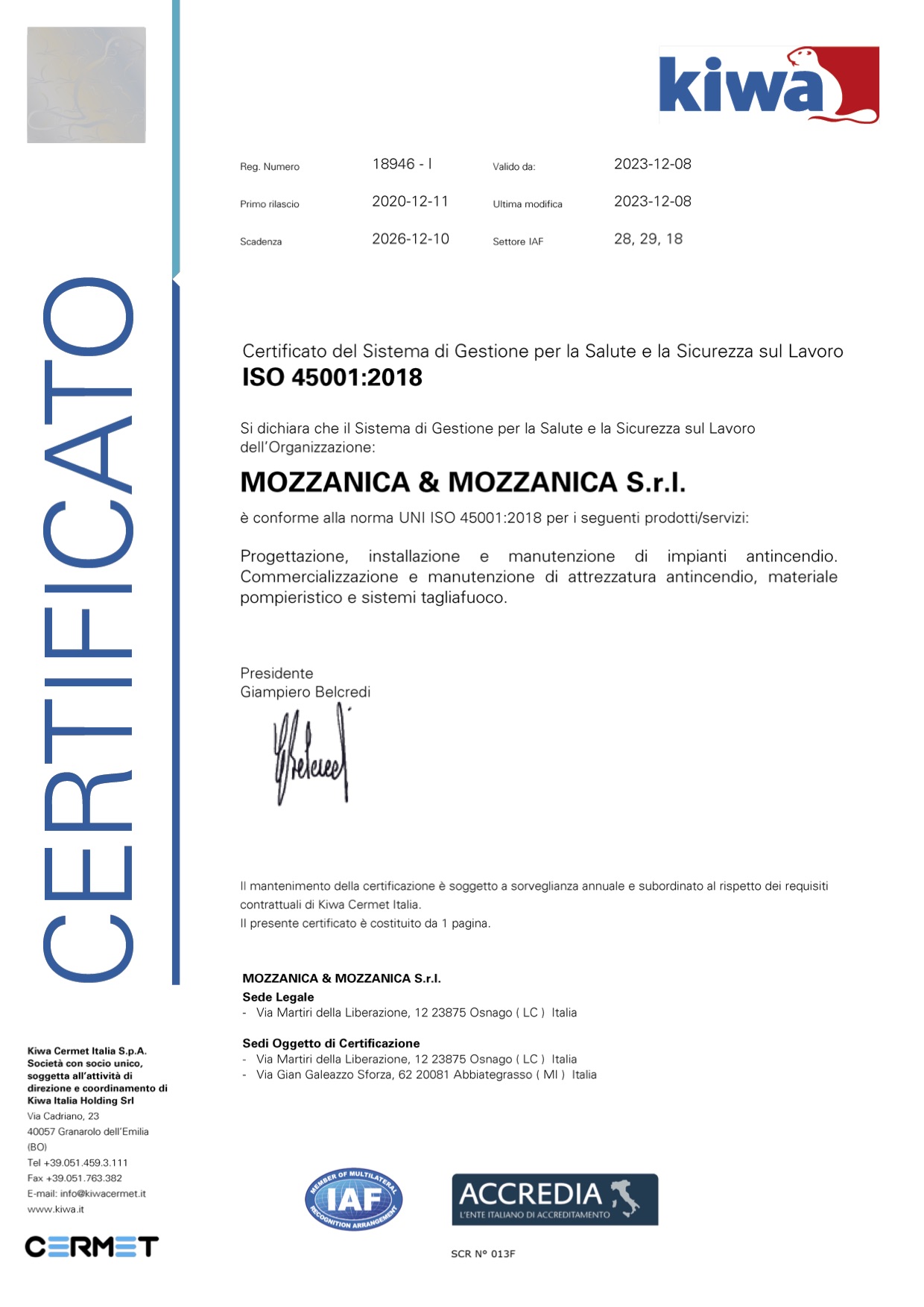 Nel 2020 Mozzanica acquisisce la certificazione ISO 45001:2018, lo standard di riferimento per il Sistema di Gestione della Salute e Sicurezza sul Lavoro riconosciuto a livello internazionale e applicabile a tutte le organizzazioni che operano nel settore privato e nel settore pubblico.