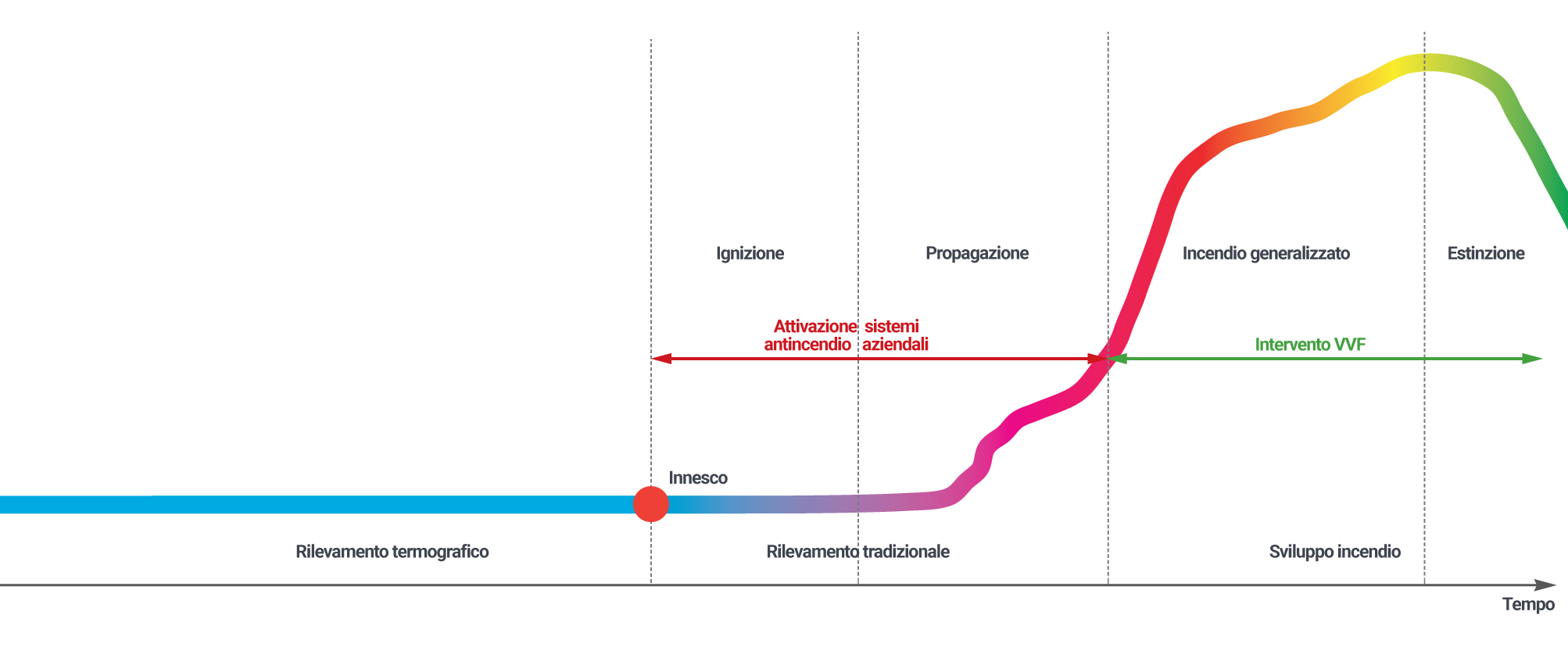 Nel grafico sono rappresentate le fasi che intervengono nella generazione di un incendio, a partire dalla fase di innesco.